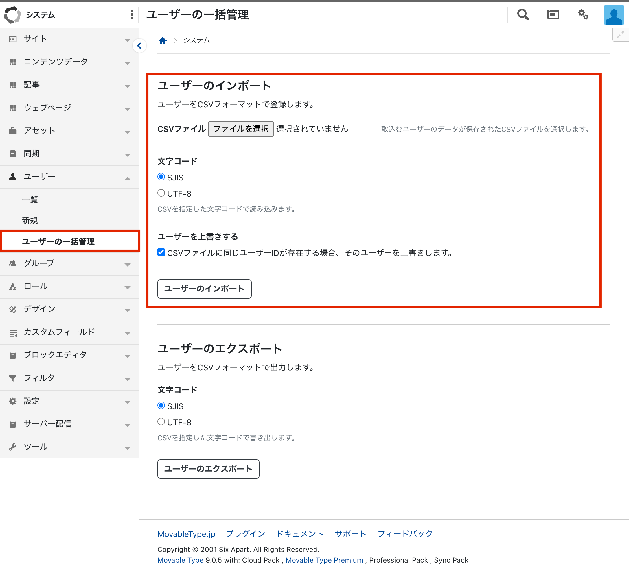 チェックボックスにチェックを入れると上書きが有効となり、チェックを入れない場合は上書きが無効となります。 - 「ユーザーの一括登録」項目内の[ユーザーのインポート]をクリックします。