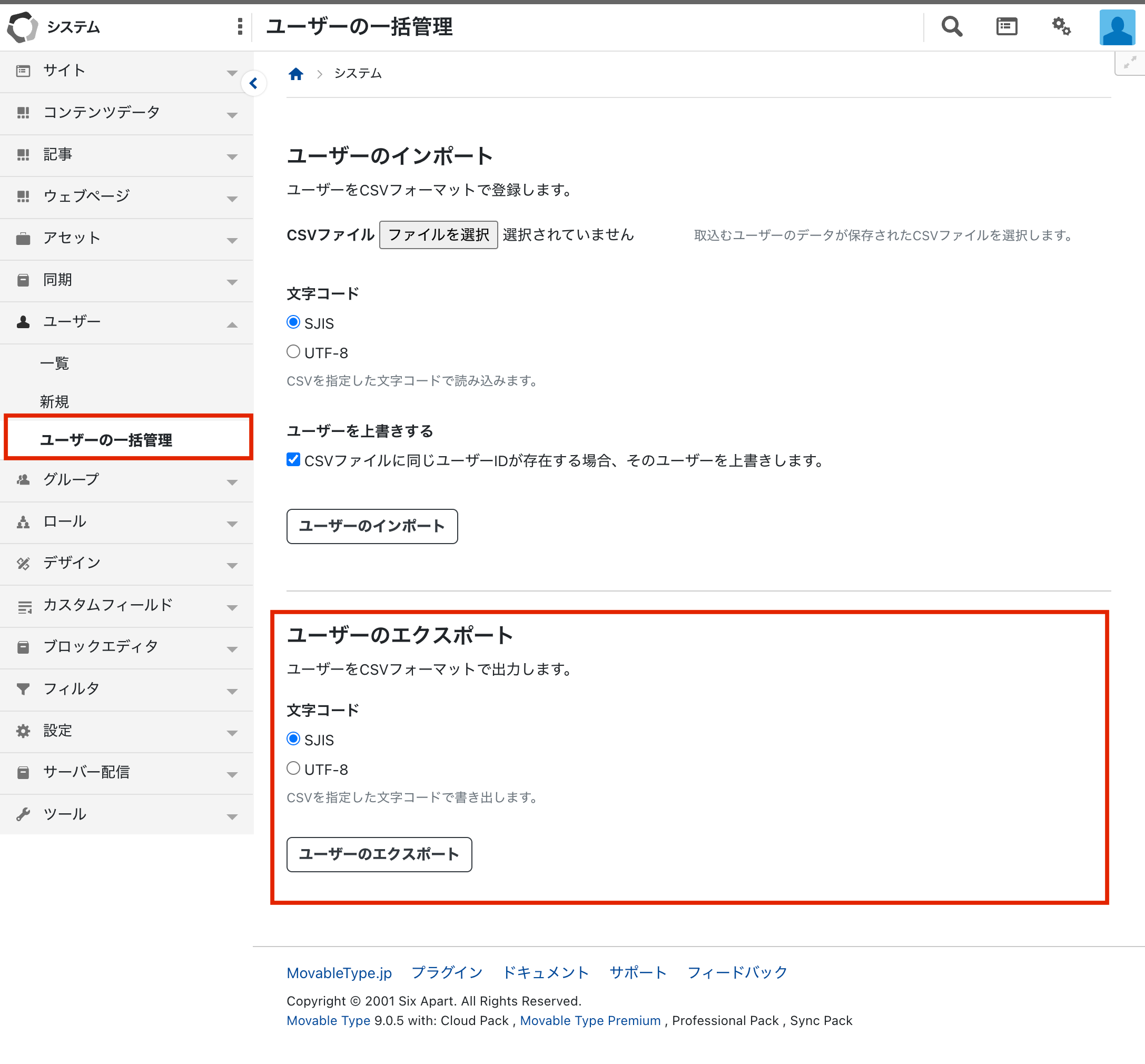 - 「ユーザーの一括出力」項目内の[ユーザーのエクスポート]をクリックします。