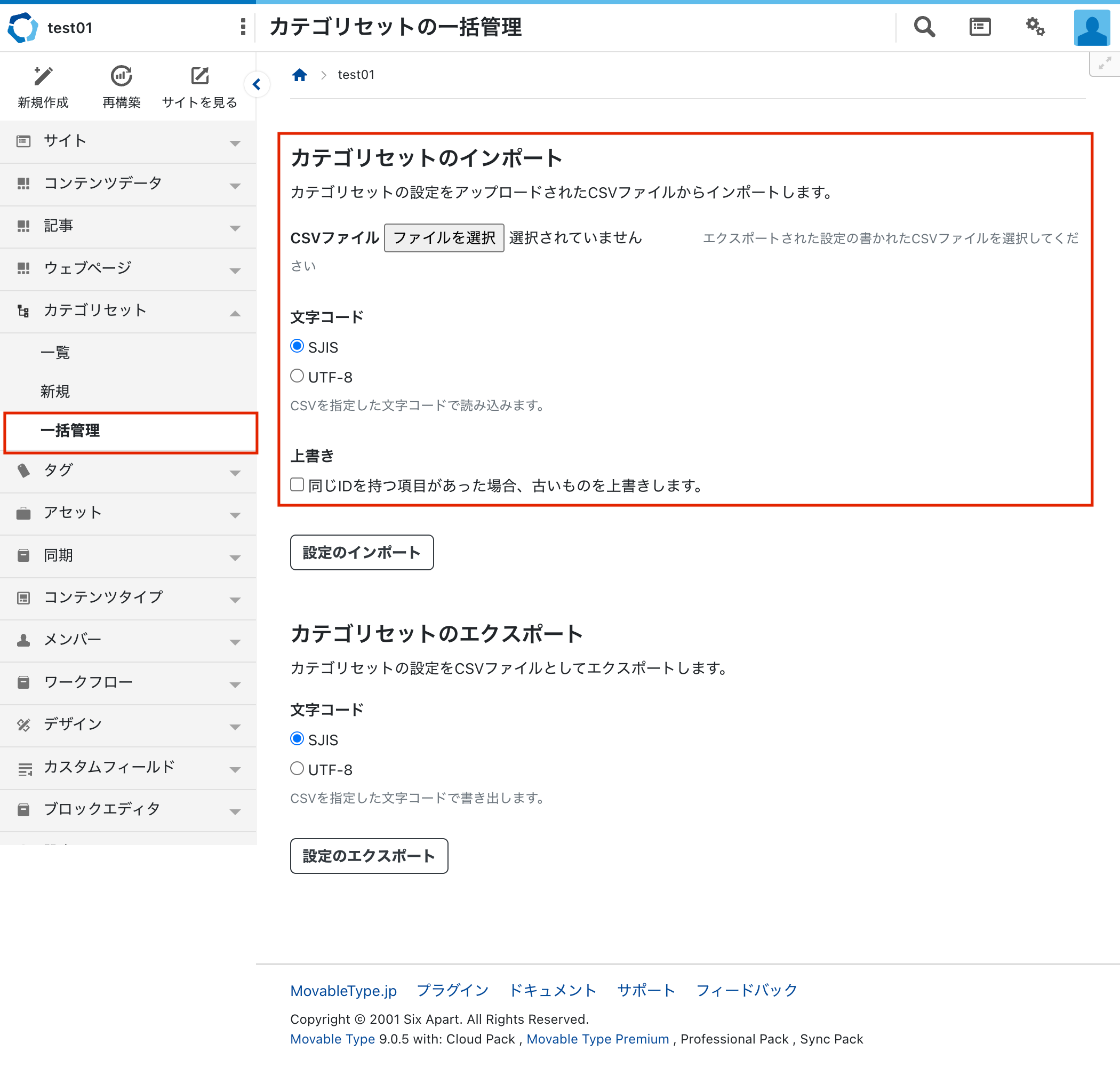 - 上書きにチェックを入れた場合、CSVのid欄にIDが記載され、かつMTのIDと一致するページが存在した場合、CSVの内容でカテゴリセットを上書きします。