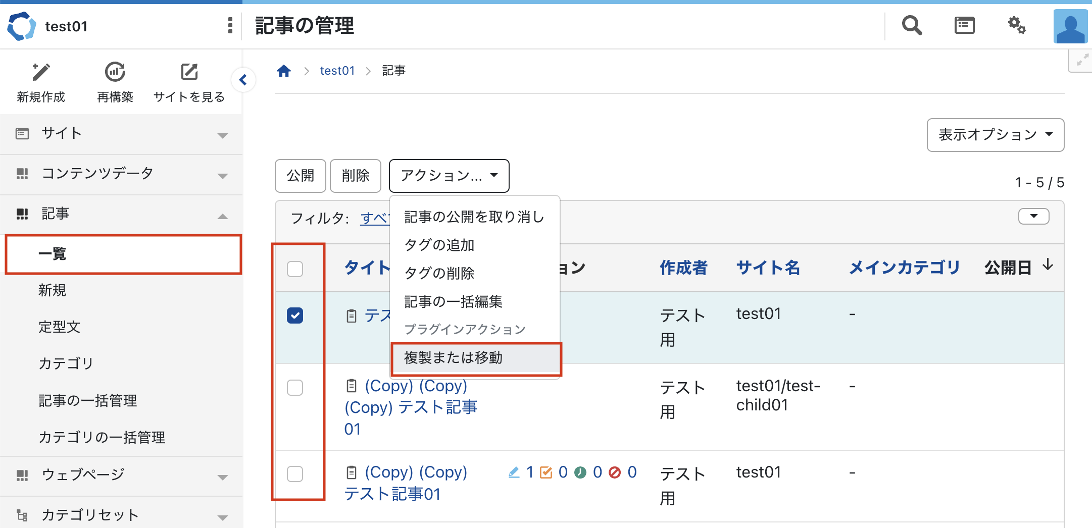 - 一覧画面から、複製または移動したい記事・ウェブページ・コンテンツデータにチェックを入れます。