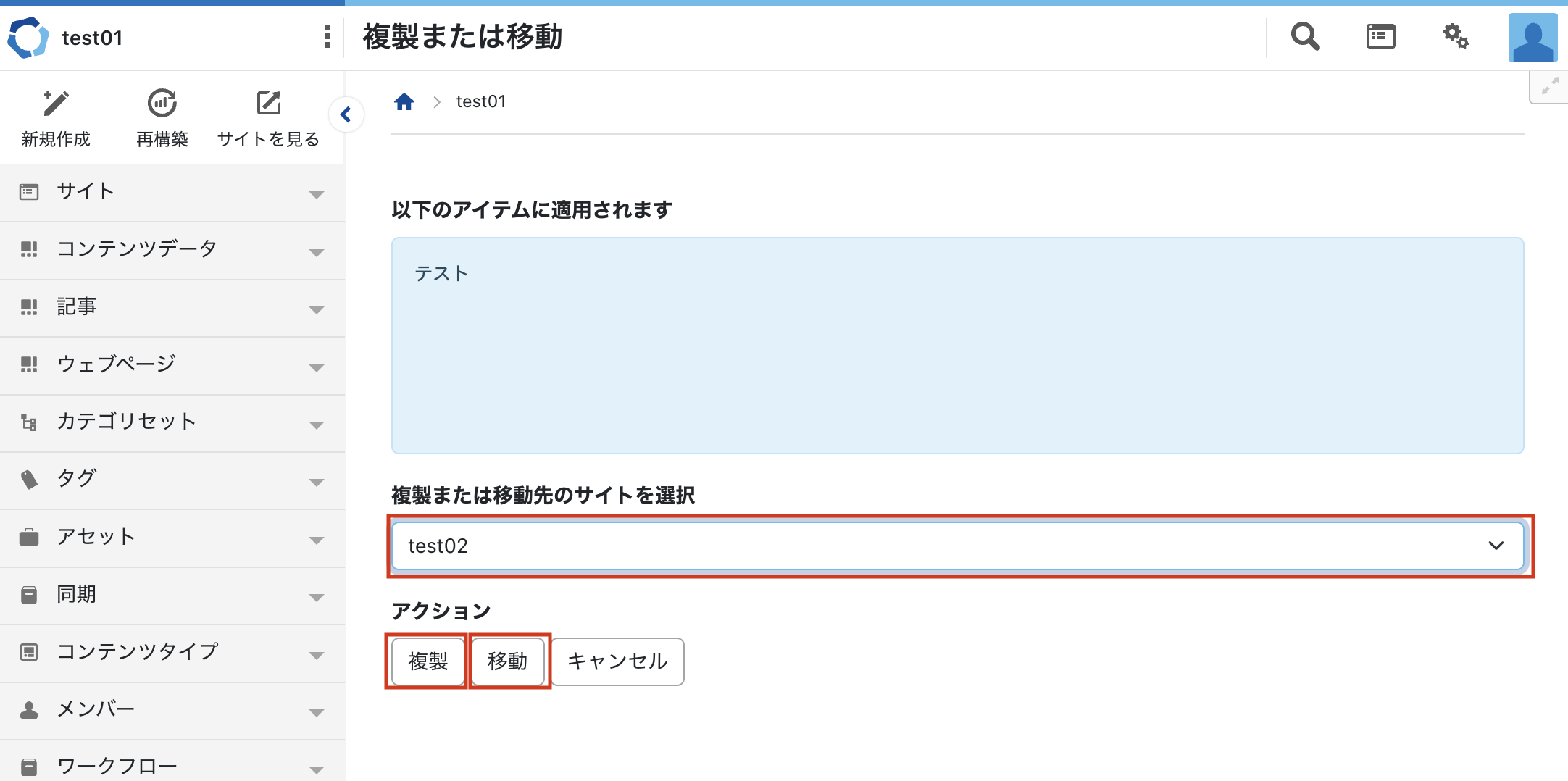 ※コンテンツデータはメニュー名が「複製」となり、[OK]ボタンをクリックしたと同時に同コンテンツタイプ内にて複製が完了します。 - 複製または移動画面に遷移しますので、[複製または移動先のブログを選択]で複製または移動先のサイト・子サイトを選択します。「アクション」の「複製」ボタンをクリックで、そのサイトまたは子サイトに記事・ウェブページを複製します。「移動」ボタンをクリックで記事・ウェブページを移動します。