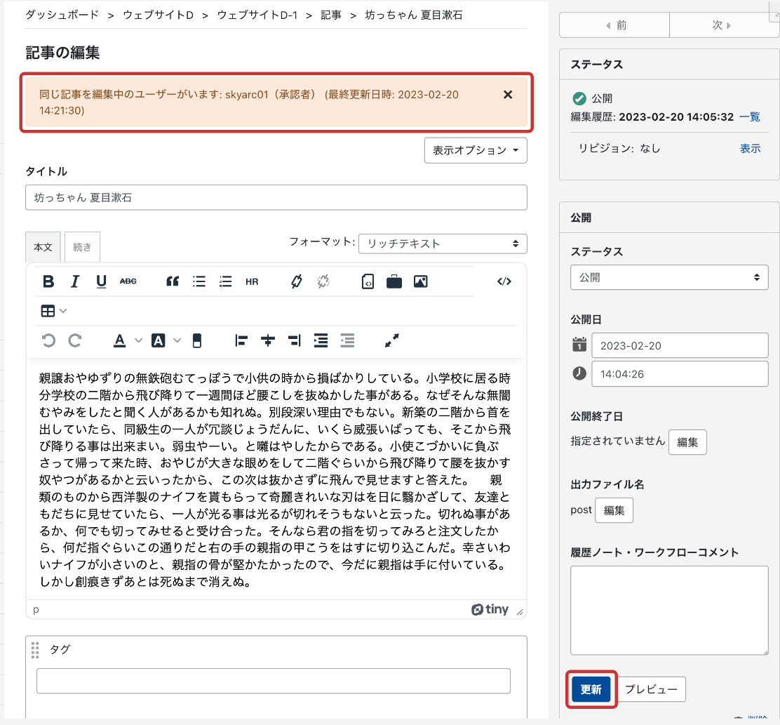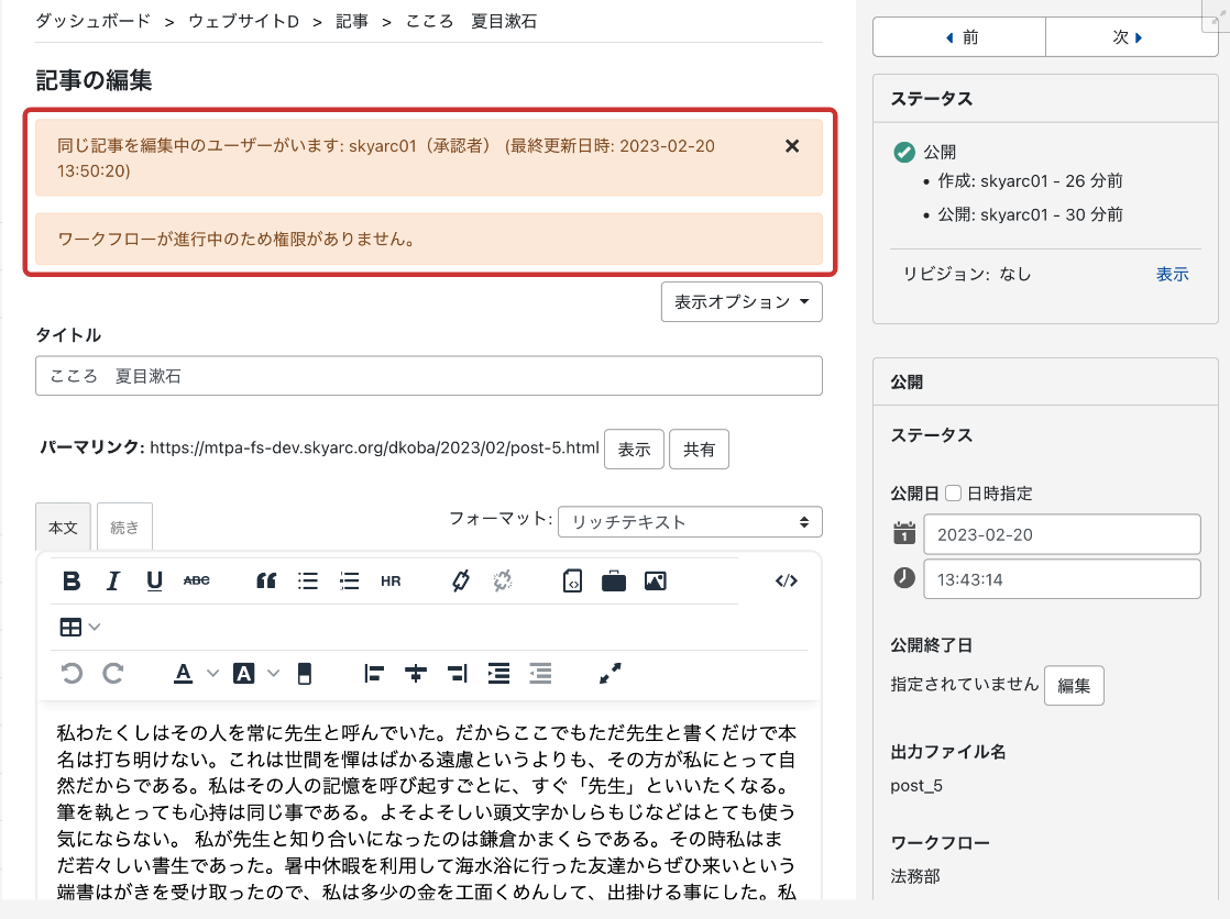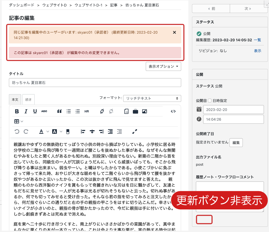 - ワークフローを設定している記事・ウェブページは[記事の編集]画面を表示する事は可能ですが、更新はできません。