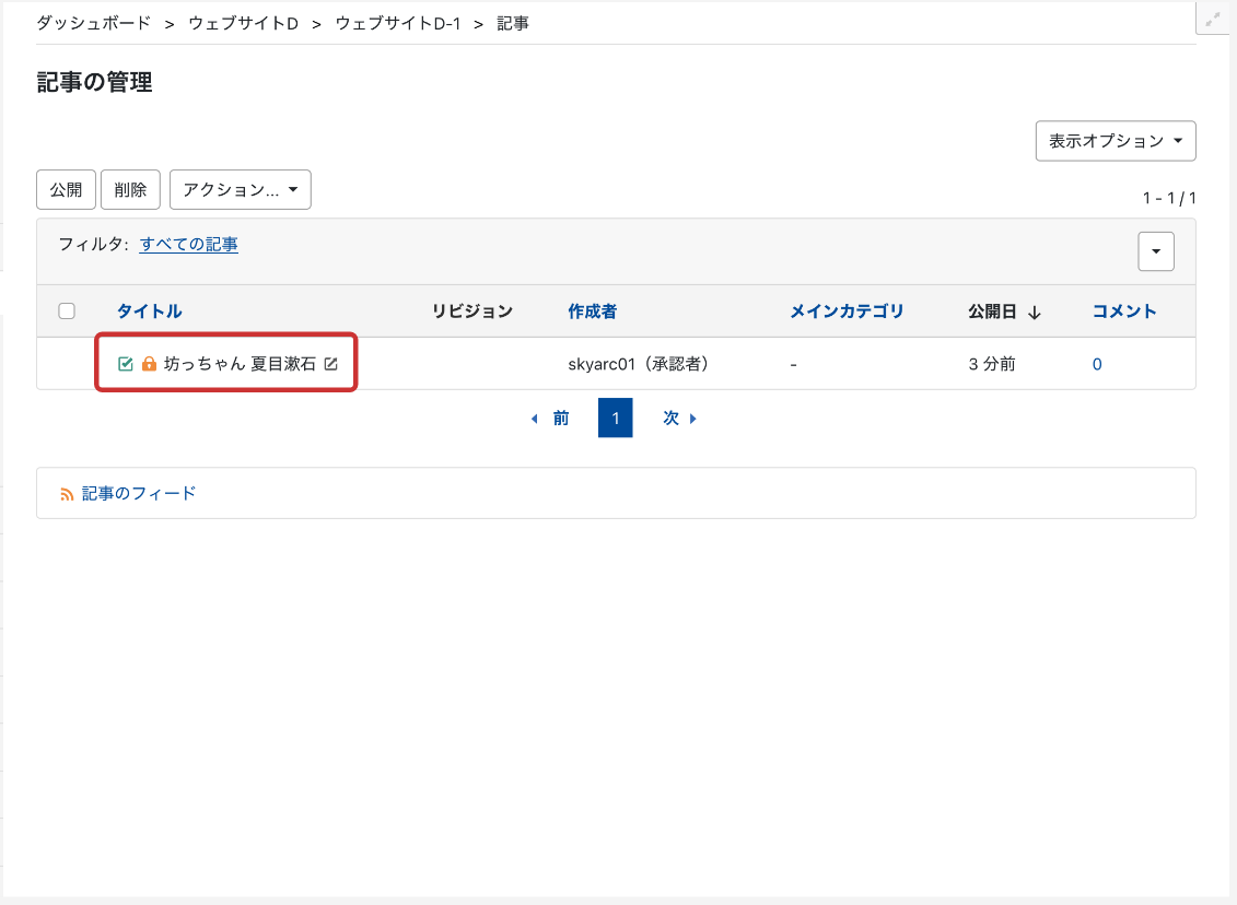 - 編集画面がロックされている際、記事、ウェブページ、コンテンツデータ、テンプレートの一覧画面では鍵マークアイコンが付与され、編集画面へのリンクが外された状態となります。