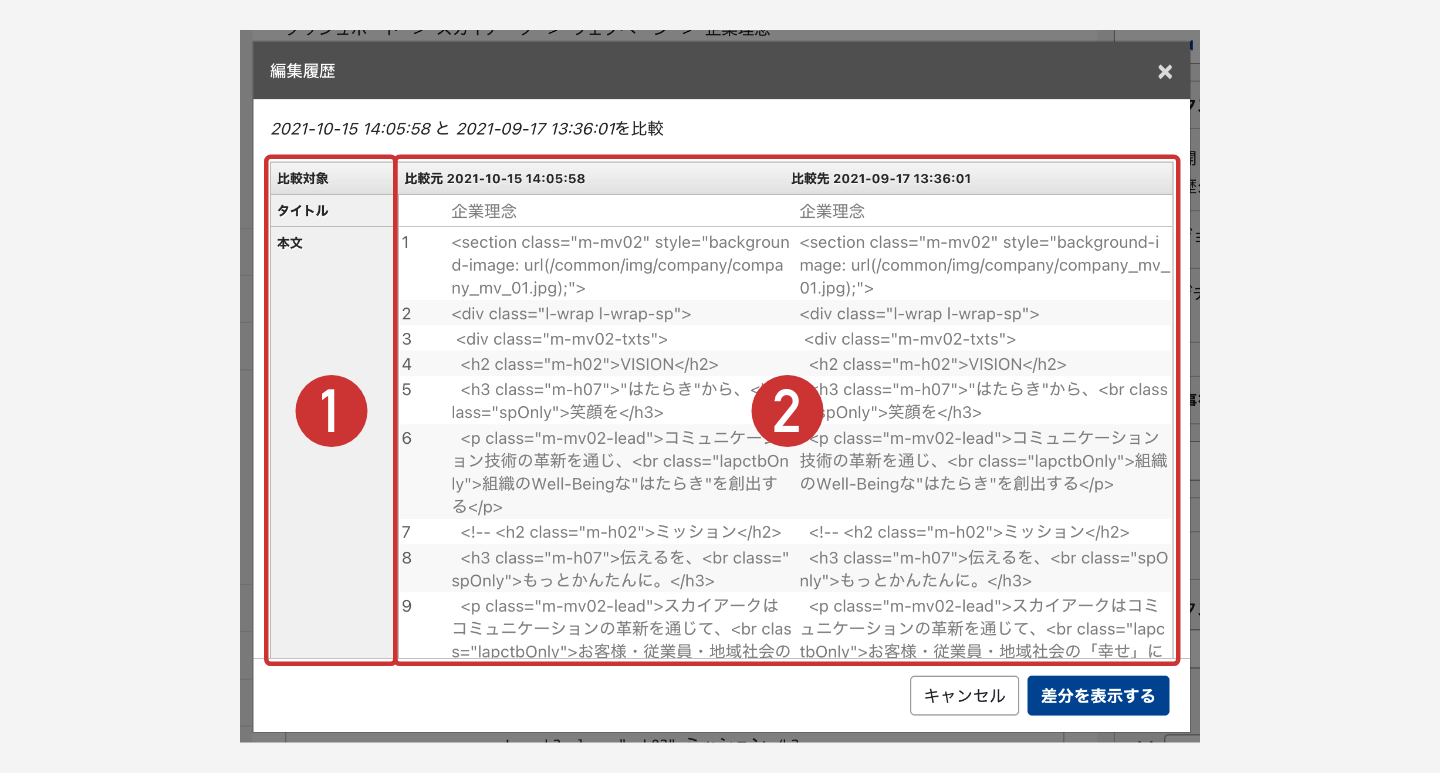 - このプラグインでは、ウェブページや記事、テンプレート、コンテンツデータで、編集履歴が存在する場合、差分を比較する事が出来ます。