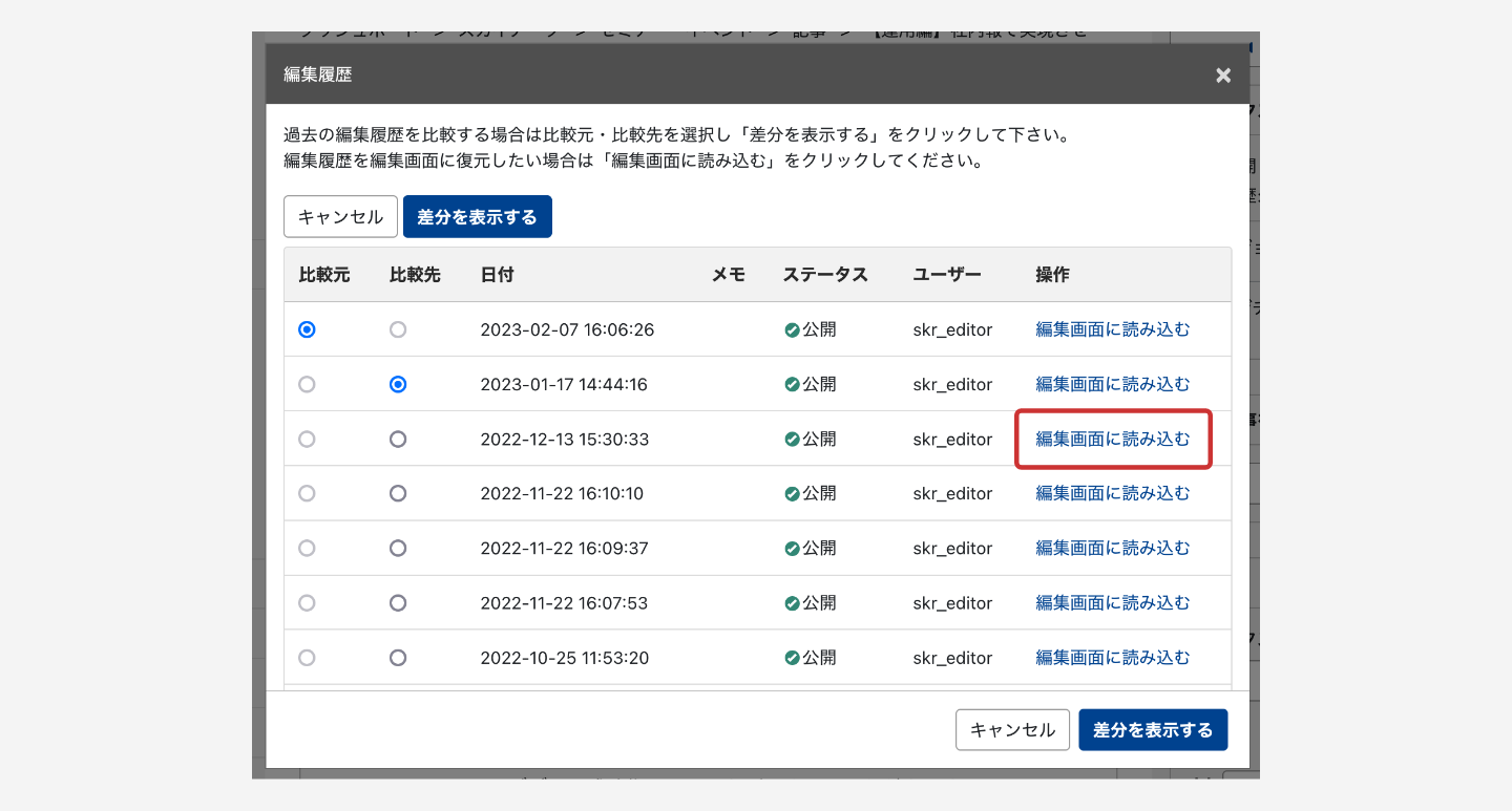 ウェブページや記事の編集履歴から、過去の編集履歴を編集画面に読み込む事が出来ます。以前の状態に戻したい時に便利な機能です。