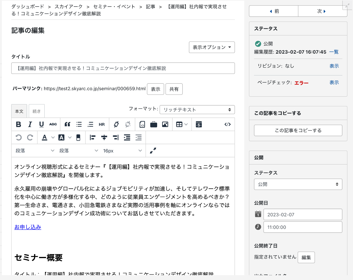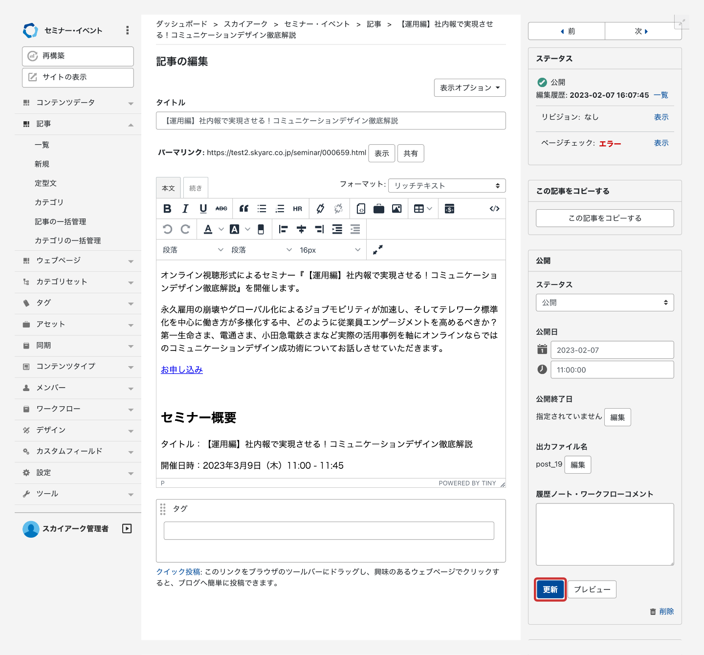 - 編集画面内に、その編集履歴が読み込まれます。この状態で保存したい場合は、[更新]ボタンをクリックします。