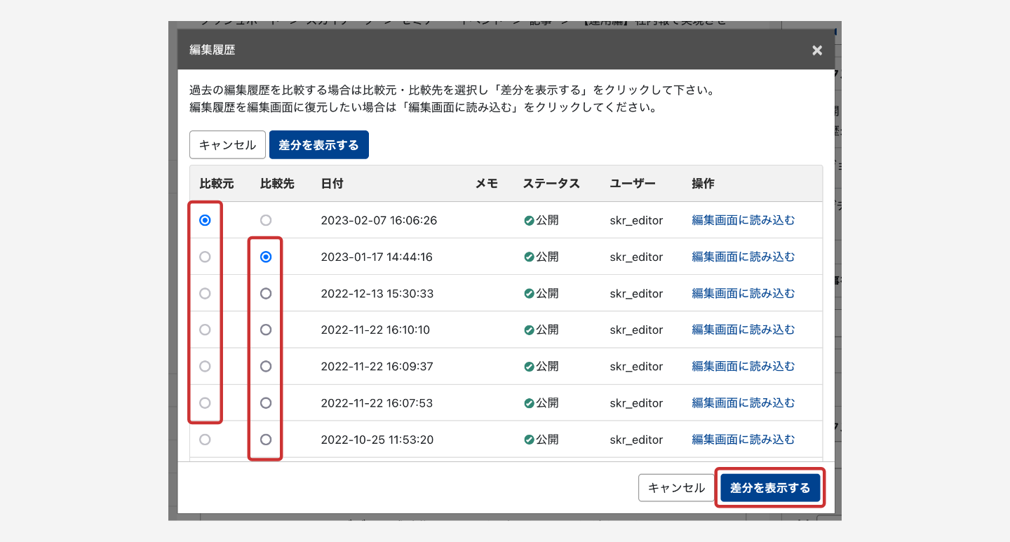 編集履歴画面を下へスクロールすると、手順3.で表示した一覧画面が表示され、現在比較している比較元と比較先のラジオボックスが選択されている状態となっています。