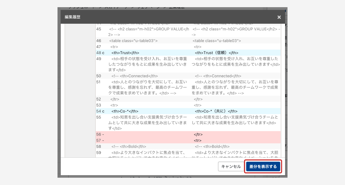 - 比較元と比較先の差分が、編集履歴画面の上部に表示されます。