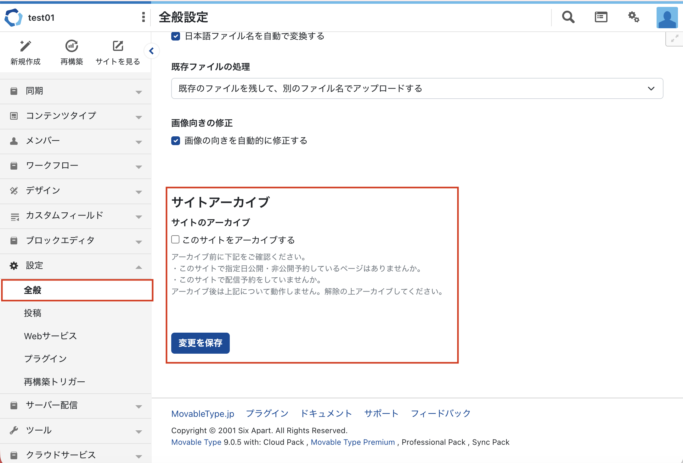 - 画面内に追加されている 「サイトのアーカイブ設定」 の項目を確認します。