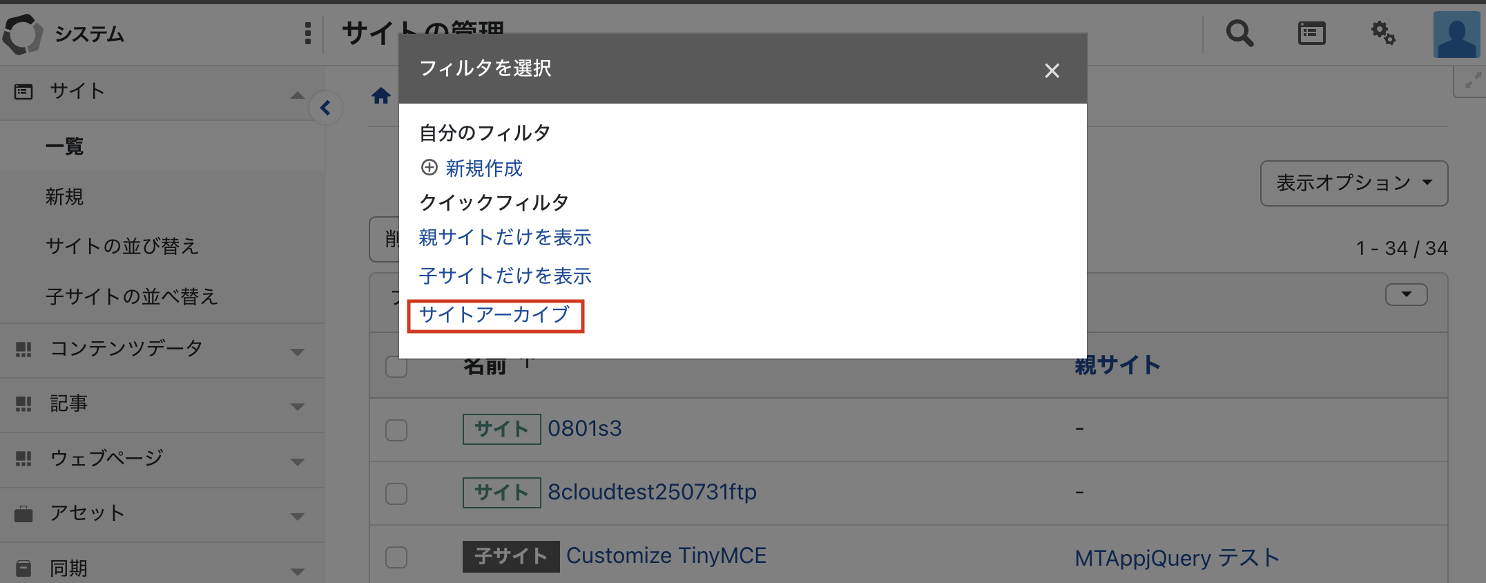 - ドロップダウンメニューから 「サイトアーカイブ」 というフィルタを選択します。