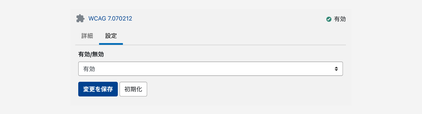 一覧の[WCAG]をクリックして[設定]タブをクリックすると、プラグインの設定画面が表示されます。