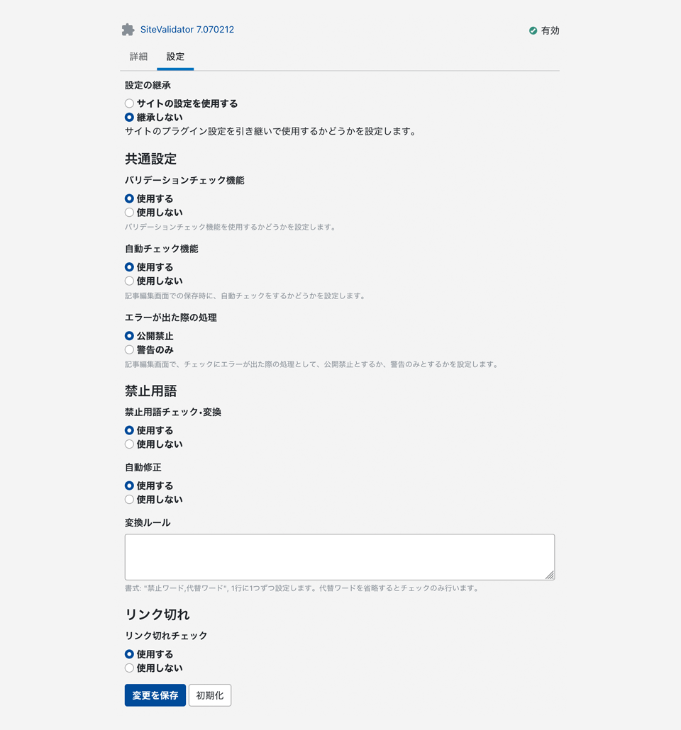ダッシュボードのメニューから、[設定]>[プラグイン]をクリックし、プラグインの管理画面に遷移します。一覧の[SiteValidator]をクリックして[設定]タブをクリックすると、プラグインの設定画面が表示されます。システムダッシュボードからのプラグイン設定画面は以下の通りです。