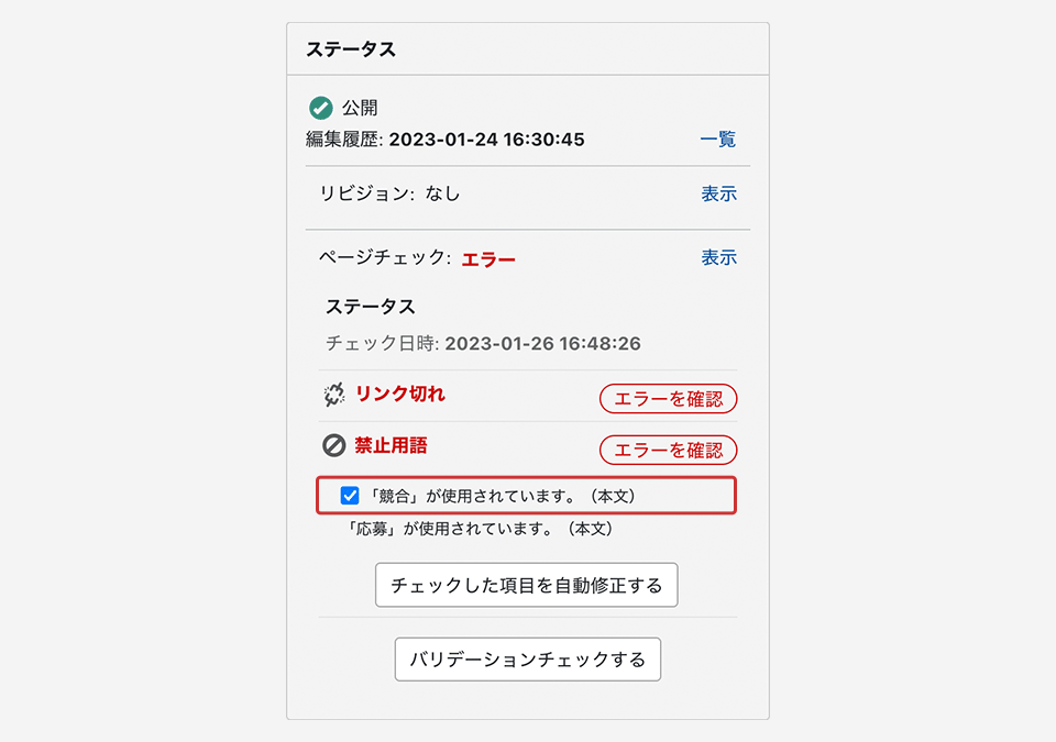 記事の編集画面のステータスウィジェットからは、バリデーションチェックのチェック結果や、エラー内容の詳細表示、自動修正を行う事が出来ます。