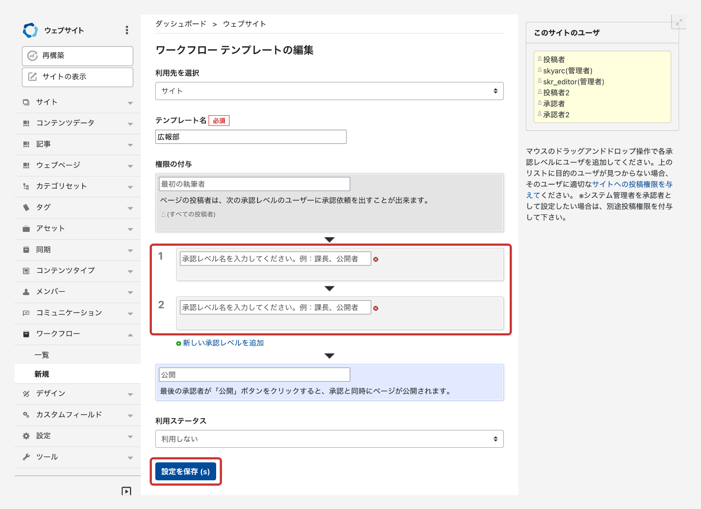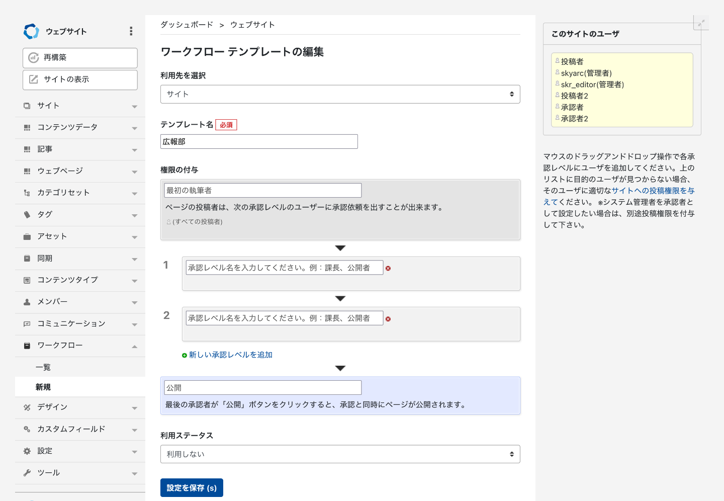 サイト全体にワークフローを設定します。記事、ウェブページ、コンテンツデータ(コンテンツタイプ)全てが対象となります。 利用ステータス 利用する:サイトに対してワークフローを設定します。すでにサイトに対して [利用する] ワークフローを設定されている場合は選択できません。 利用しない:ワークフローを利用しません。利用先が重複されている場合でも設定を保存することはできます。 |