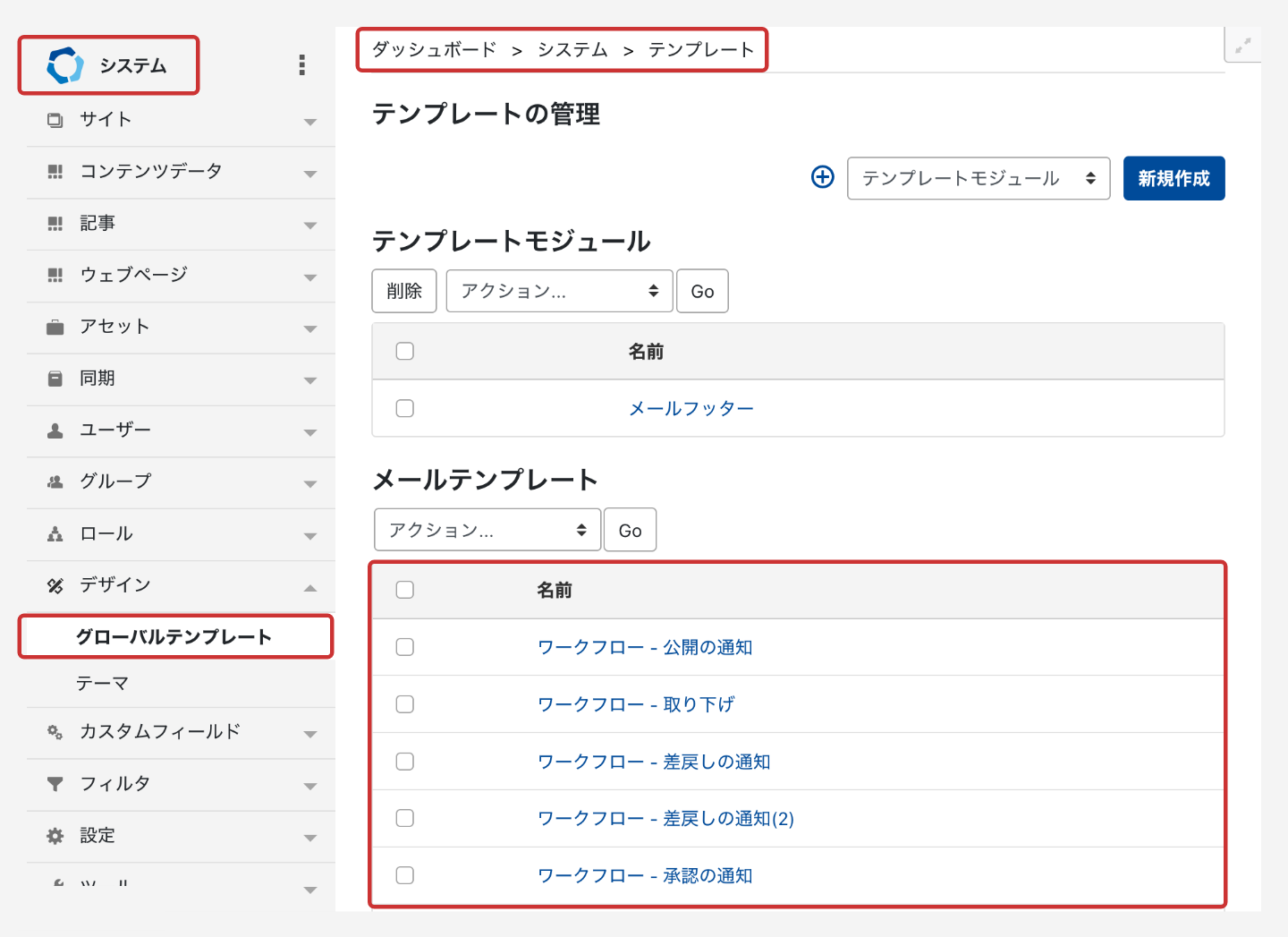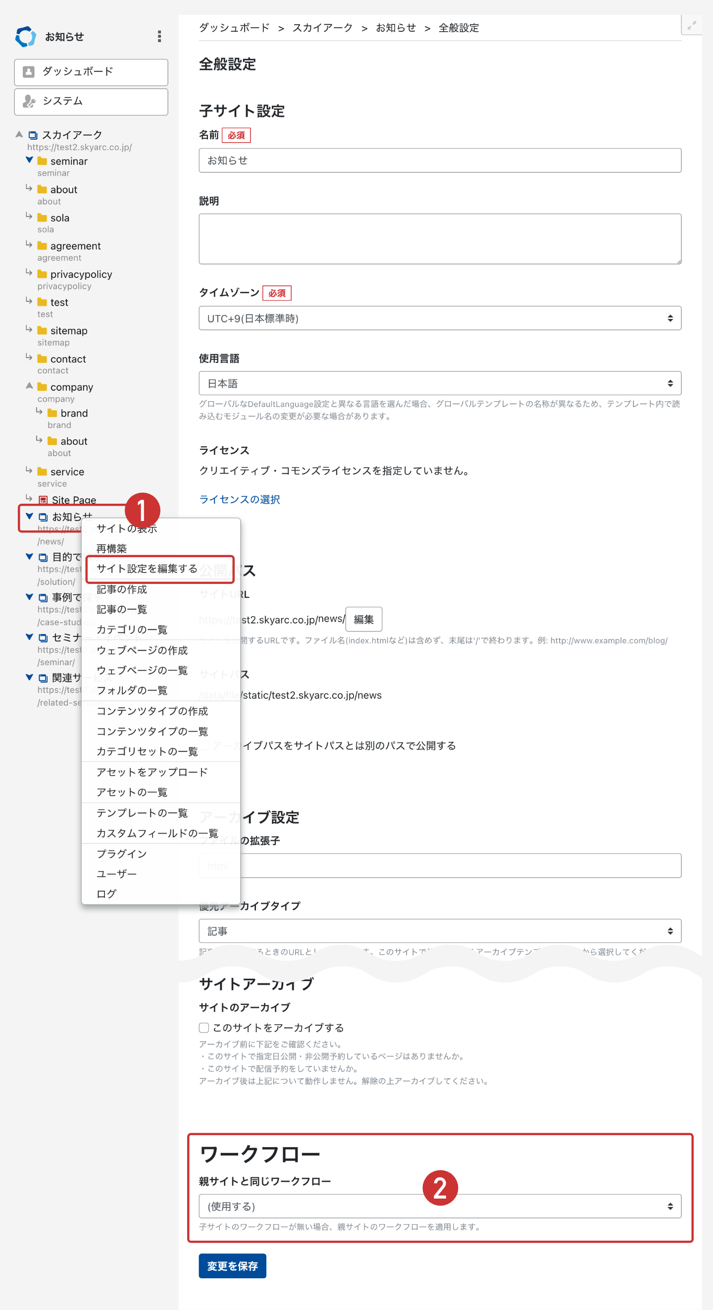 システムのWorkflowプラグイン設定は、全てのサイト/子サイトで共通の設定となります。サイト個別に設定を行うことのできない設定項目ですので、変更の際はご注意ください。